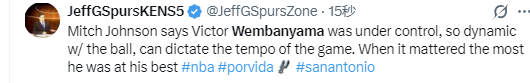 在谈到文班亚马的表现时,约翰逊说道:“我觉得他只要能保持冷静,持球进攻时的冲击力就会极强。他完全能掌控比赛的节奏。当然,他有时候节奏会有些急躁。这话听起来可能有点不合适,但他毕竟才21岁,而且此前缺阵了一段时间,上场时间也没达到自己的预期。所以有时候他会急于打出表现,想立刻做出贡献。这对他来说,也是一个持续成长、不断打磨的过程。很明显,在比赛最关键的时刻,他打出了最佳状态。我们每次都需要他这样的表现,也会和他一起继续打磨、变得更好。”