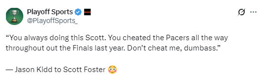 由于当时福斯特不允许基德挑战克里斯蒂的干扰球,基德极其不满,他对福斯特喊道:“斯科特,你总是来这一套。去年总决赛你就全程偏袒,坑了步行者队。别在我这儿耍阴招,蠢货。”