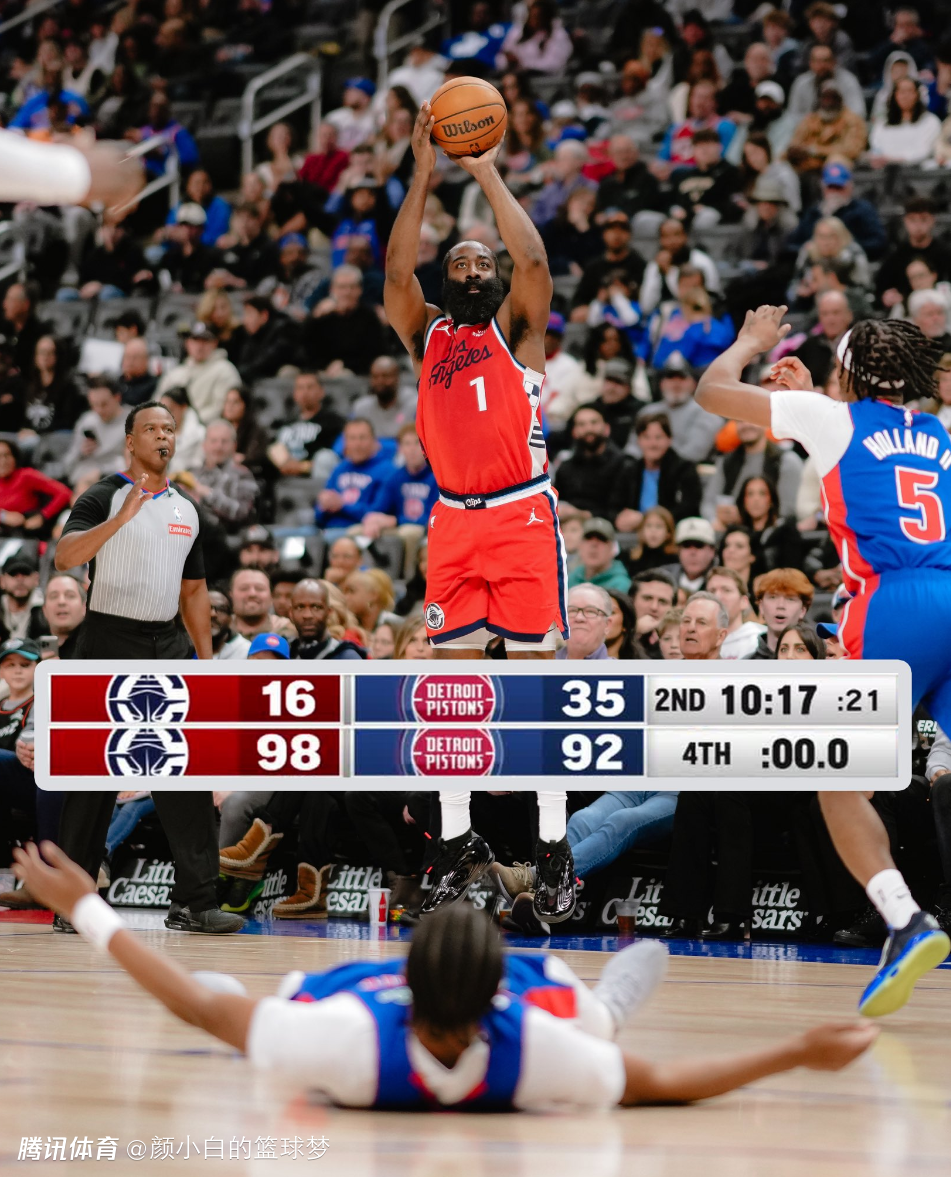 第二节还剩10分17秒快船已经落后活塞19分了,但比赛打完快船还险胜6分,这场比赛快船再一次展现了他们强大的防守能力,说实话此役哈登的手感很差,全场比赛20中4+三分7中1,但他在终场前1分钟完成关键2+1帮助快船反超,那个球就是最涨士气的一球。