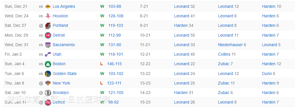 过去的11场比赛快船赢下了其中的9场,快船目前15胜23负距离西部第十的灰熊只差1个胜场,快船又燃起了附加赛的希望,而这一波11战9胜的基本盘就是哈登。