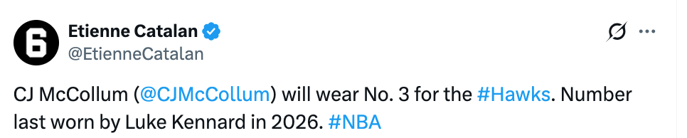 北京时间1月11日,据球衣记者Etienne Catalan报道,CJ-麦科勒姆在老鹰将继续身披3号球衣。