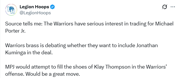 北京时间1月12日,美媒Legion Hoops报道称,金州勇士队对交易得到小迈克尔-波特抱有浓厚兴趣。勇士管理层正就是否将库明加纳入交易筹码展开讨论。小波特将力争填补克莱在勇士进攻体系中的空缺。这笔交易若是达成,将会是一步妙棋。