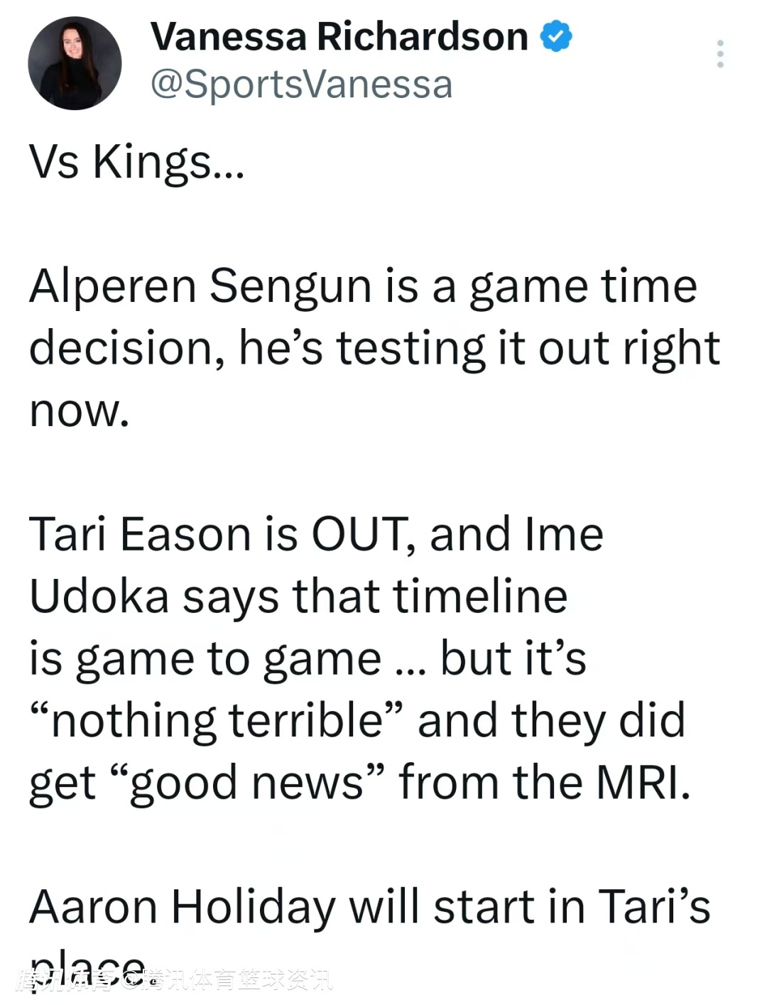 伊森将确定缺阵。乌度卡表示伊森归期将为逐场评估,不过他强调伤情并无大碍,且核磁共振检查已传来“好消息”。阿隆-霍勒迪将顶替伊森进入首发阵容。