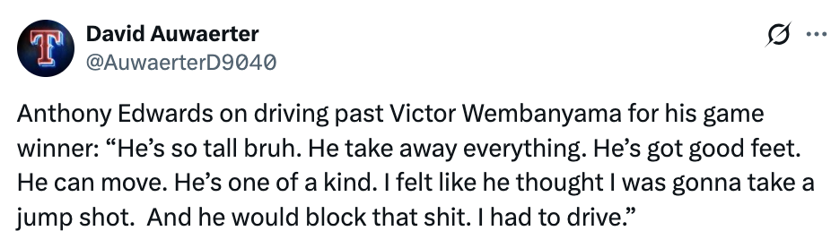 谈及自己突破文班亚马命中绝杀球,华子表示:“那家伙太高了,兄弟,他能罩住一切,脚步也很灵活,移动能力强,他是独一档的存在。我感觉他以为我会跳投,那球肯定会被他盖掉。所以我必须突破。”