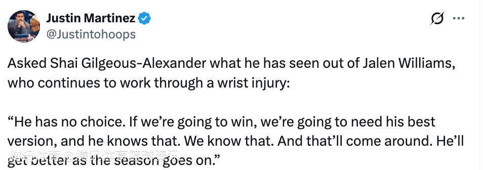 谈到杰威伤愈回归后的表现,亚历山大表示:“他没得选。如果我们想赢球,就需要他拿出最佳状态,他清楚这点,我们也清楚。他的状态会回来的,随着赛季推进,他会越来越好。”此役杰威拿到18分4篮板4助攻。