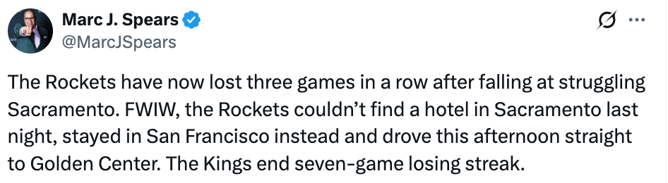 北京时间1月12日,NBA常规赛,火箭客场98-111不敌国王,遭遇3连败。赛后,名记斯皮尔斯透露,火箭队昨晚在萨克拉门托找不到酒店,只好住在旧金山,今天下午(当地时间)直接驱车前往国王主场。