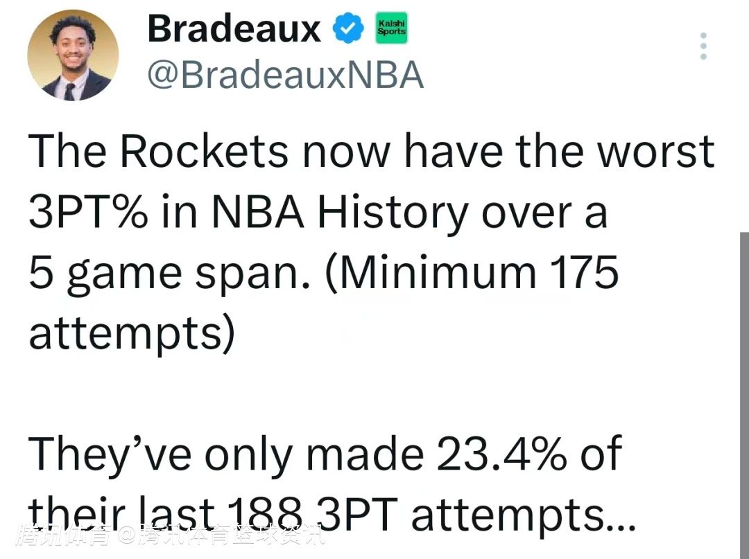 根据数据统计显示,本场比赛战罢,火箭创下NBA历史5场比赛区间三分命中率最差纪录(要求至少出手175次)。球队过去188次三分出手,命中率仅23.4%。