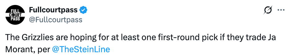 北京时间1月12日,据名记Stein报道,灰熊队若交易莫兰特,希望至少得到一个首轮选秀权。