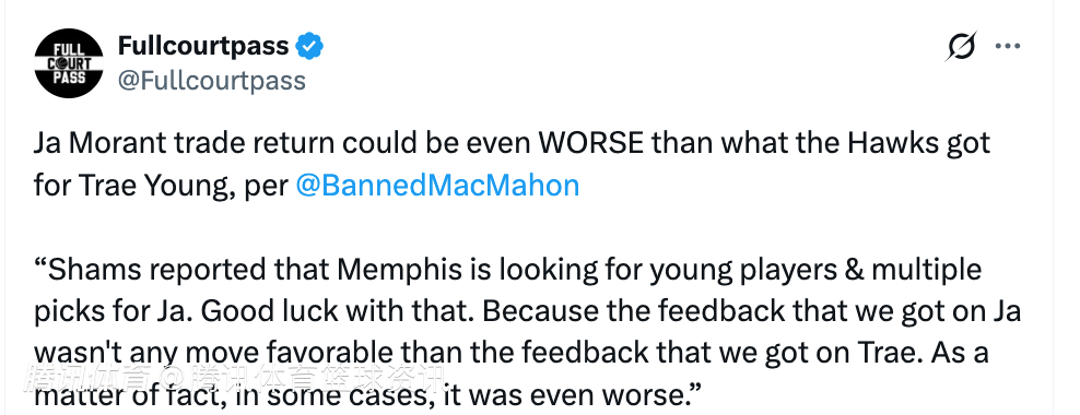 麦克马洪表示:“Shams报道称,灰熊方面希望为莫兰特换回年轻球员和多个选秀权。祝他们好运吧。因为我们得到的关于莫兰特的反馈,并不比当初特雷-杨的反馈更积极。事实上,在某些情况下,甚至还要更糟。”