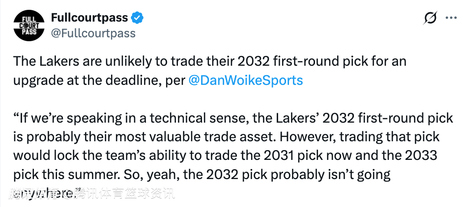 北京时间1月13日,据湖人队记DanWoike报道,湖人不太可能为了在交易截止日前升级阵容而送出他们2032年的首轮签。