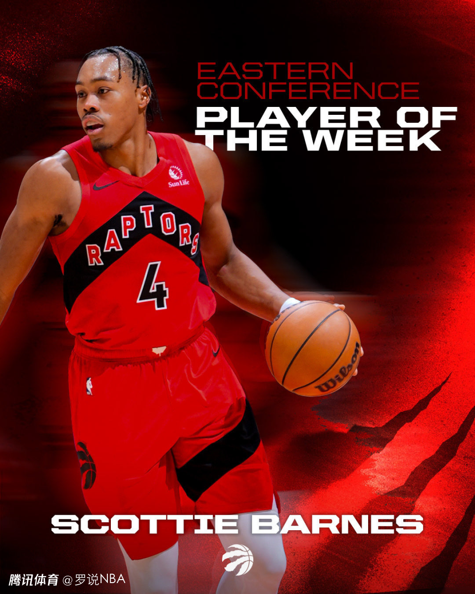 猛龙队上周同样打出3胜1负的表现,巴恩斯场均得到22分、6.3个篮板和6.0次助攻,他出战了其中获胜的3场比赛。