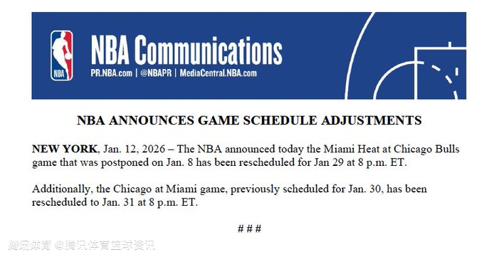 北京时间1月13日,NBA官方发文宣布,1月9日延期的热火对阵公牛的比赛,已重新安排在1月30日上午9点进行;此外,原定于1月31日的公牛客场挑战热火的比赛,调整至2月1日上午9点开打。