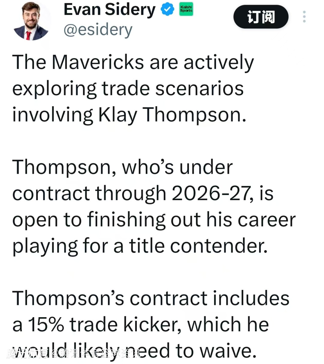 北京时间12月18日,根据记者Evan Sidery的报道,独行侠队正在积极探讨涉及克莱-汤普森的交易方案。