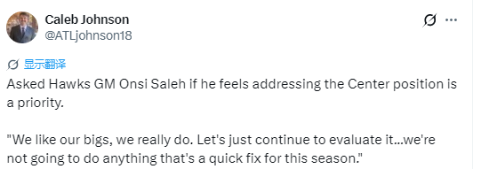北京时间1月13日,老鹰总经理萨利赫在接受采访时,被问及是否认为补强中锋位置是球队的当务之急。