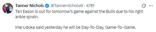 北京时间1月13日,NBA常规赛继续进行,火箭明日将对阵公牛。赛前,火箭方面表示,队内球员伊森因右脚踝扭伤,将缺席本场比赛。火箭主帅乌度卡昨日表示,伊森的伤情将采用每日观察、逐场评估的管理方式。