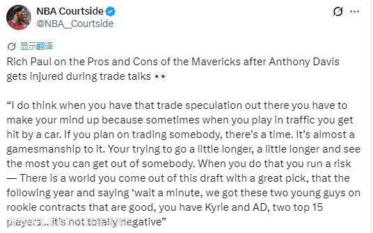 “当然,事情也并非全无转机:独行侠完全有可能在这次选秀中摘得一个高顺位签,到了下赛季就会发现,‘等等,我们手里有两位新秀合同期的优质年轻球员,还有欧文和浓眉这两位联盟前十五的球星……’所以说,这件事也并非完全是坏事。”