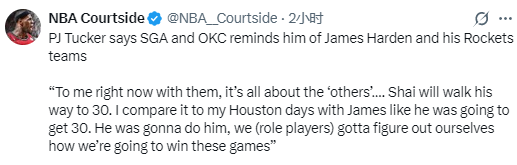 塔克说道:“在我看来,如今这支雷霆的赢球关键,全在角色球员身上。亚历山大轻描淡写就能砍下30分,这让我想起在休斯顿和哈登并肩的日子,哈登当时也是这样,30分信手拈来。球星只管做好自己的事就行,而我们这些角色球员,得自己想办法,找到赢下比赛的节奏和方法。”