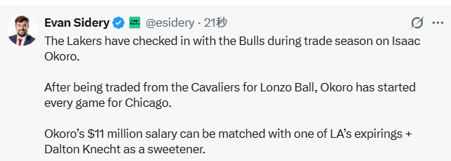 北京时间1月13日,据名记Sidery报道,湖人已经向公牛询价奥科罗,双方进行了初步沟通。