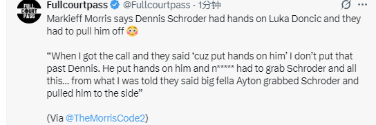 大莫里斯在节目中说道:“我接到电话,他们说‘那家伙动手推了他’,我一点都不意外施罗德会这么做。他确实跟东契奇有了肢体冲突,其他人赶紧冲上去拉住施罗德……据我所知,是大个子艾顿一把抓住施罗德,把他拉到了一边。”