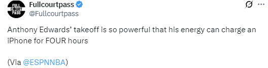 ESPN在视频中介绍道:“爱德华兹的快肌纤维运动速度在NBA中冠绝联盟,正是这些快肌纤维储存的能量,让他扣篮起跳的瞬间能爆发出5000瓦的峰值功率,可以给苹果手机充电4小时。”