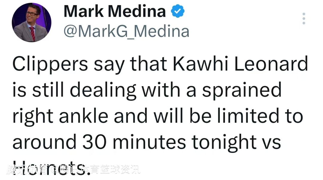 北京时间1月13日,NBA常规赛继续进行,快船对阵黄蜂。赛前,快船官方表示,莱昂纳德仍在受右脚踝扭伤的困扰,今天对阵黄蜂的比赛,他的出场时间将被限制在30分钟左右。