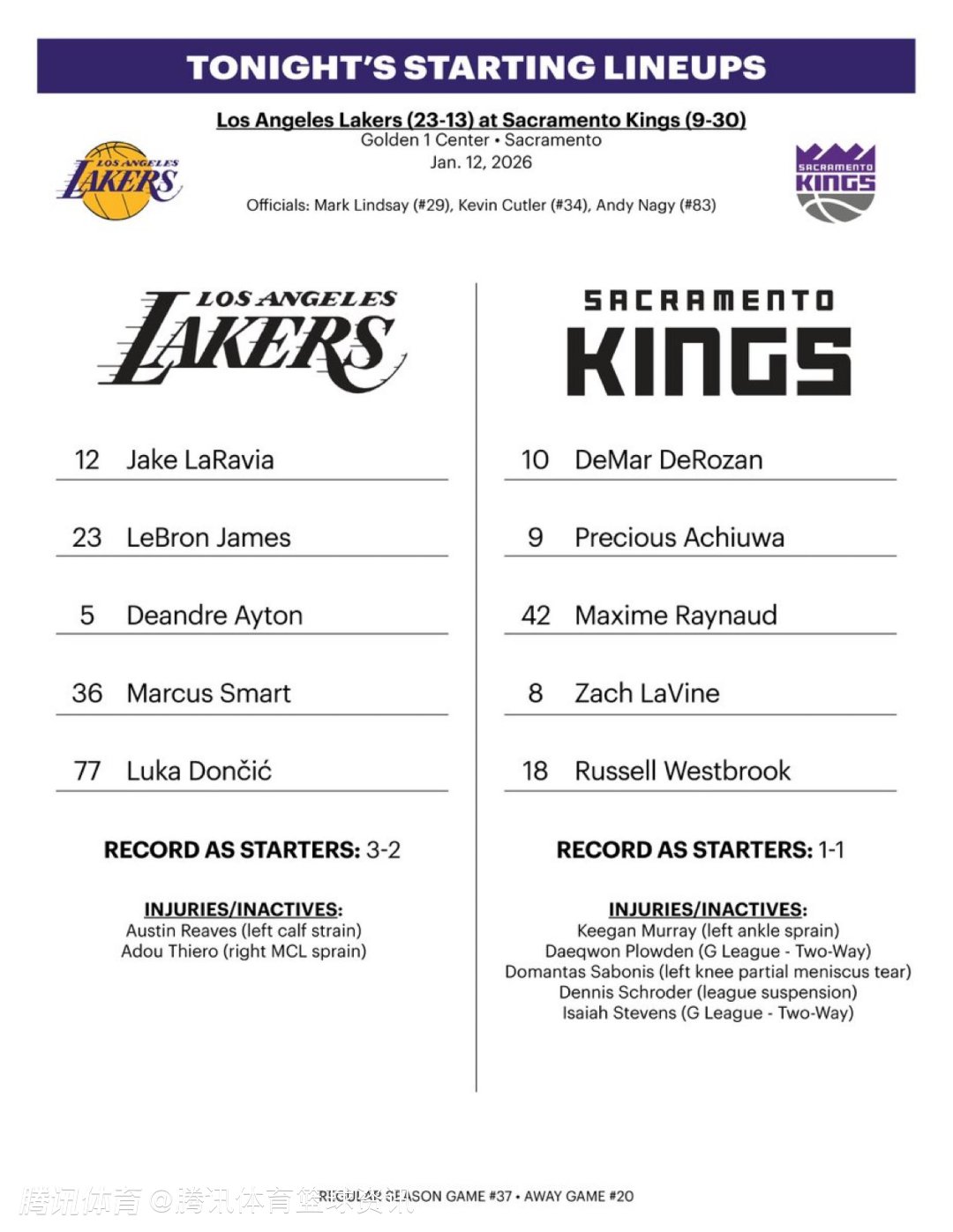 北京时间1月13日,NBA常规赛继续进行,湖人队对阵国王队。赛前,双方公布了本场比赛的首发阵容。