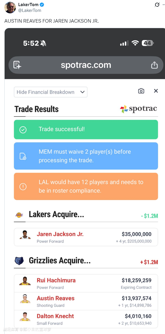 湖媒laker Tom还模拟了一套交易得到小贾伦的方案,他建议用八村垒、里夫斯、克内克特去换小贾伦-杰克逊,而且在这笔交易中湖人并没有送出首轮签。