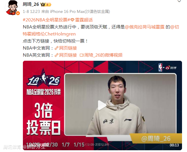 周琦先是在1月8日给同为“竹竿人”的雷霆总冠军球员霍姆格伦拉票,周琦拍摄视频拉票,同时还写道:“NBA全明星投票火热进行中,要说顶级天赋,还得是@俄克拉荷马城雷霆 的@切特霍姆格伦ChetHolmgren。”