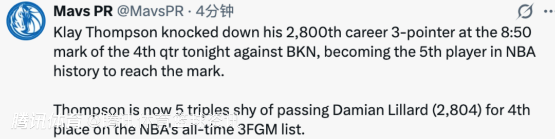北京时间1月13日,NBA常规赛,独行侠主场对阵篮网,本场比赛克莱三分球迎来里程碑。