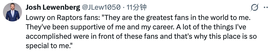 谈及猛龙队球迷,洛瑞表示:“对我来说,他们是世界上最棒的球迷。他们一直支持着我和我的职业生涯。我取得的很多成就,都是在这些球迷面前达成的,这就是为什么这里对我来说如此特别。”