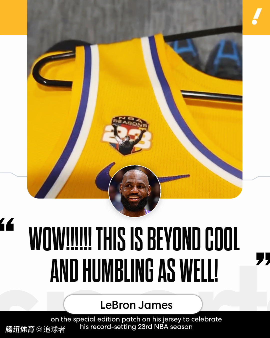 今日,詹姆斯的23号战袍上绣着特殊的纪念臂章,纪念他创历史纪录的第23个赛季,臂章上绣着“NBA第23个赛季”“詹姆斯赛前抛镁粉仪式的剪影”和三条彩色条纹,分别代表他效力过的三支球队:骑士、热火和湖人。