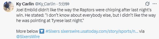 恩比德还透露,在昨日的比赛中,马丁曾向马克西挥手道别,他对此很不舒服。“我不清楚其他人的感受,但我很反感他昨晚对着马克西指指点点的样子,”恩比德补充道,“所以没错,这就是为什么今晚我必须让全队都打起十二分精神,我自己也以身作则定下比赛节奏,而我们确实打出了完美的开局。”