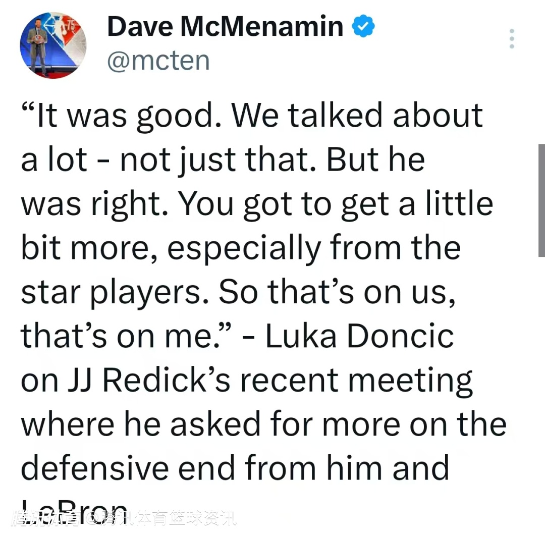 东契奇还谈及与主帅雷迪克近期的会面,据悉,此次会面中雷迪克希望东契奇与詹姆斯能在防守端投入更多精力,对此,东契奇表示:“这次交流很有意义。我们聊了很多,远不止防守这一件事。但他说得没错,我们确实需要再提升一档,尤其是身为球队核心的球员。这是我们的责任,更是我的责任。”
