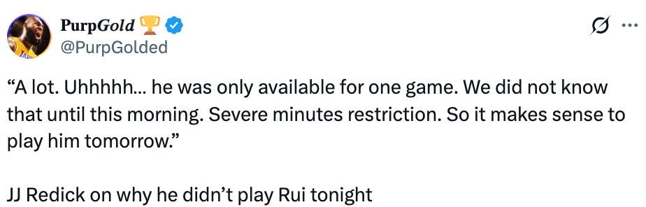 谈及本场比赛为何没让八村垒出战,雷迪克表示:“原因有很多,因为他只能打一场比赛,而且我们直到今天早上才知道这个情况。他有严格的出场时间限制,所以让他明天出战更合理,而且我们已经把他放进了伤病报告。”