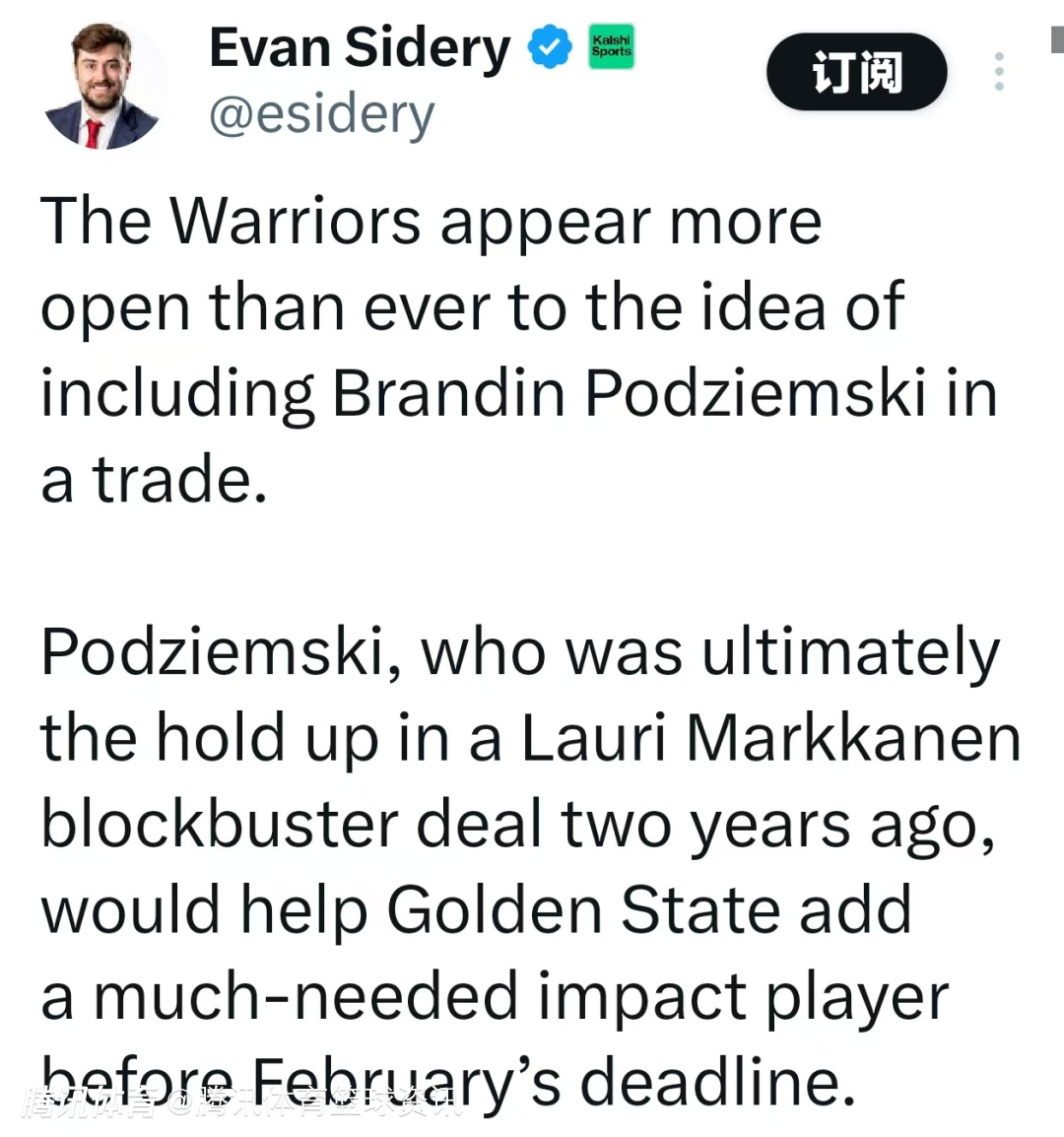Sidery表示,两年前那笔围绕马尔卡宁的重磅交易最终搁浅,波杰姆斯基正是当时的关键阻碍因素。而如今,若能将他交易出去,勇士有望在二月交易截止日前,补强一名球队急需的即战力球员。