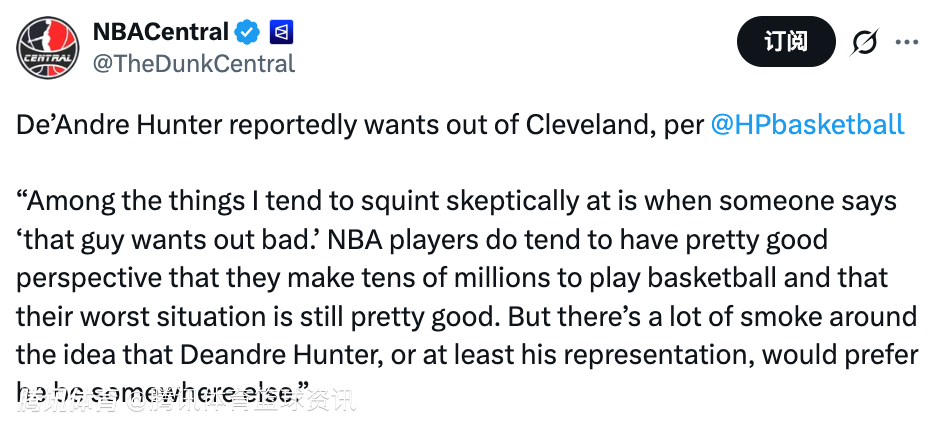 摩尔表示:“我总是会带着怀疑的眼光看待‘某个人迫切想离队’这类说法,NBA球员通常都很清楚,他们打球能赚数千万美元,就算处境再差,也已经相当不错了。但围绕德安德烈-亨特,或者至少是他的经纪人团队,有大量迹象表明他们更希望他能去其他球队。”