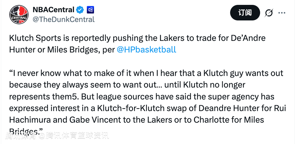 摩尔表示:“每次听到Klutch旗下的球员想离队,我都不知道该作何反应,因为他们似乎总是想走,直到Klutch不再代理他们为止。但联盟消息人士称,这家顶级经纪公司已经向湖人表达了兴趣,希望促成一笔‘Klutch 内部互换’——用德安德烈-亨特换来八村垒和文森特;或者向夏洛特黄蜂队提出交易,得到迈尔斯-布里奇斯。”
