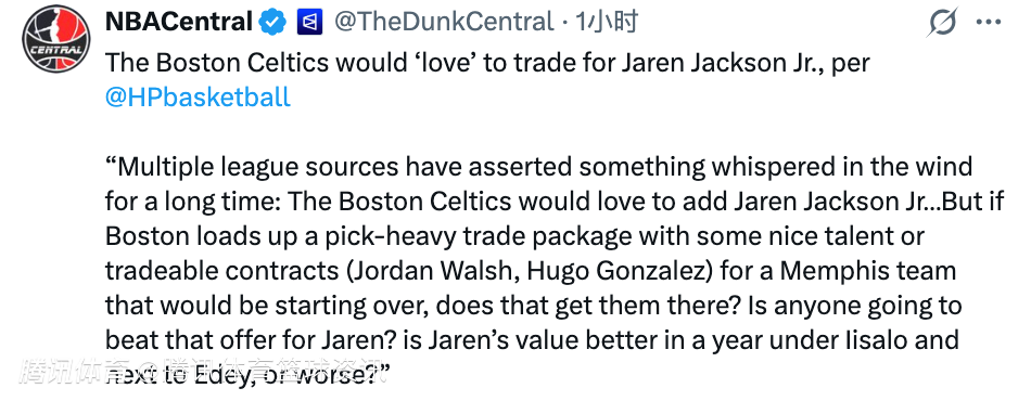 摩尔表示:“多位联盟消息人士证实了这个流传已久的传闻,凯尔特人队非常希望得到小贾伦-杰克逊。但如果绿军为正处于重建阶段的灰熊队,开出一个包含大量选秀权、外加优质年轻球员或可交易合同(比如乔丹-沃尔什、冈萨雷斯)的丰厚筹码,这能打动灰熊吗?会有其他球队为小贾伦开出比这更好的报价吗?在伊萨洛教练的执教下,和扎克-伊迪并肩作战一年后,小贾伦的价值会变得更高,还是更低?”
