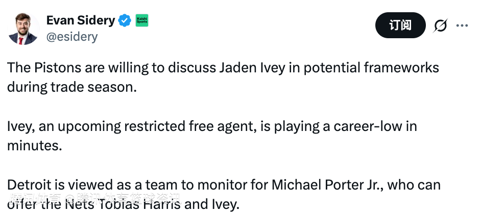 北京时间1月14日,据美记Evan Sidery报道,活塞队愿意在交易窗口期讨论涉及杰登-艾维的潜在交易方案。活塞被认为是关注小迈克尔-波特的潜在下家之一,他们可以向篮网队提供托哈里斯和艾维作为筹码。