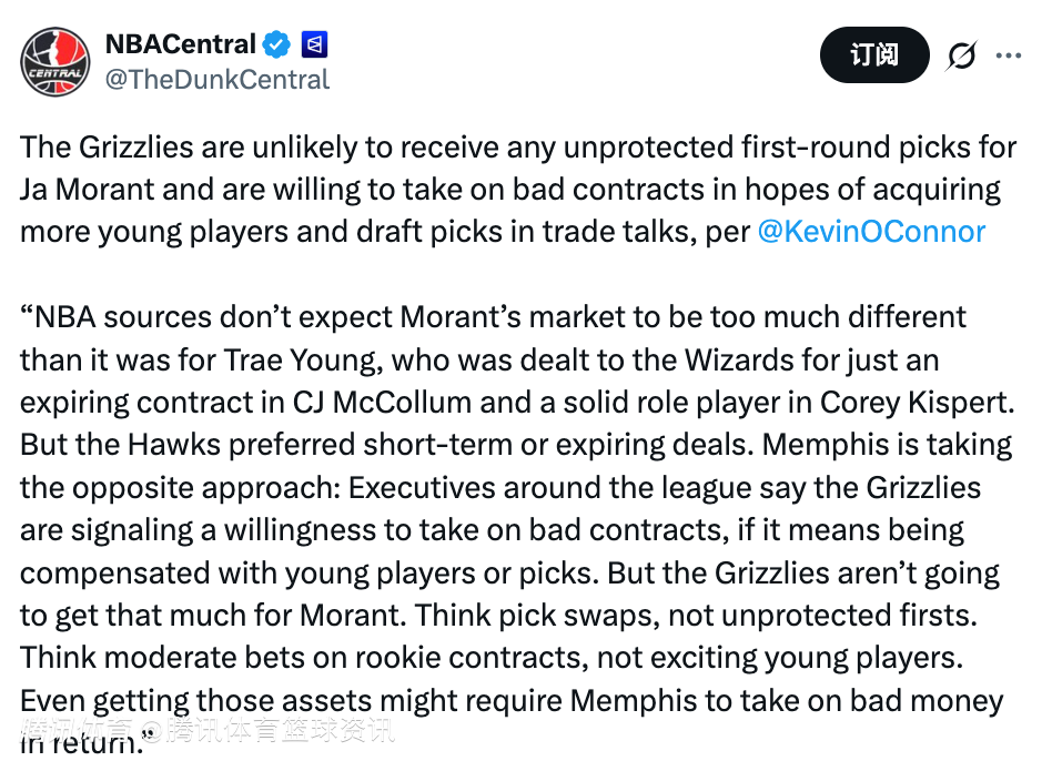 “但灰熊队不会为莫兰特换来太多回报,你可以想象是选秀权互换,而非无保护首轮签;是对新秀合同的适度押注,而非令人兴奋的年轻球员。即便要得到这些资产,灰熊可能也需要接受垃圾合同作为交换。”