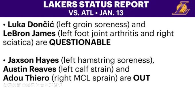 北京时间1月14日,NBA常规赛继续进行,湖人将对阵老鹰。赛前,湖人官方更新球队本场比赛伤病报告,东契奇(左腹股沟酸痛)、詹姆斯(左脚关节关节炎和右坐骨神经痛)均出战成疑。
