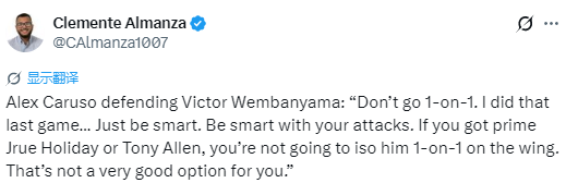 卡鲁索还谈到如何防守文班亚马:“别跟他一对一硬刚,上一场我就试过了。打球得动脑子,进攻选择要明智。就算是巅峰期的霍勒迪或托尼-阿伦,你也不会让他们在侧翼单防他、跟他一对一单打,这对你来说绝非上策。”