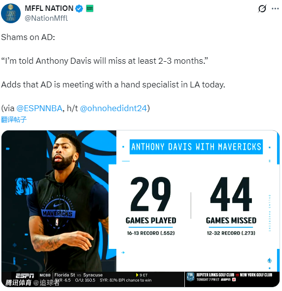 名记Marc Stein报道,达拉斯方面对安东尼-戴维斯能否在三月份复出抱有一些乐观态度,即使他接受左手手术。