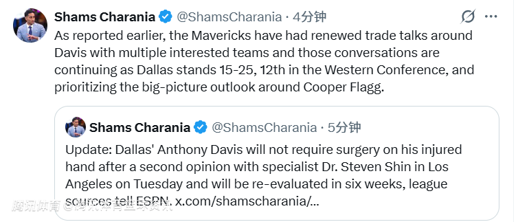 北京时间1月14日,据名记Shams报道,达拉斯独行侠的安东尼-戴维斯今日在洛杉矶接受了史蒂文-申医生的二次诊断,认为他受伤的手不需要手术,将在六周后再次接受评估。