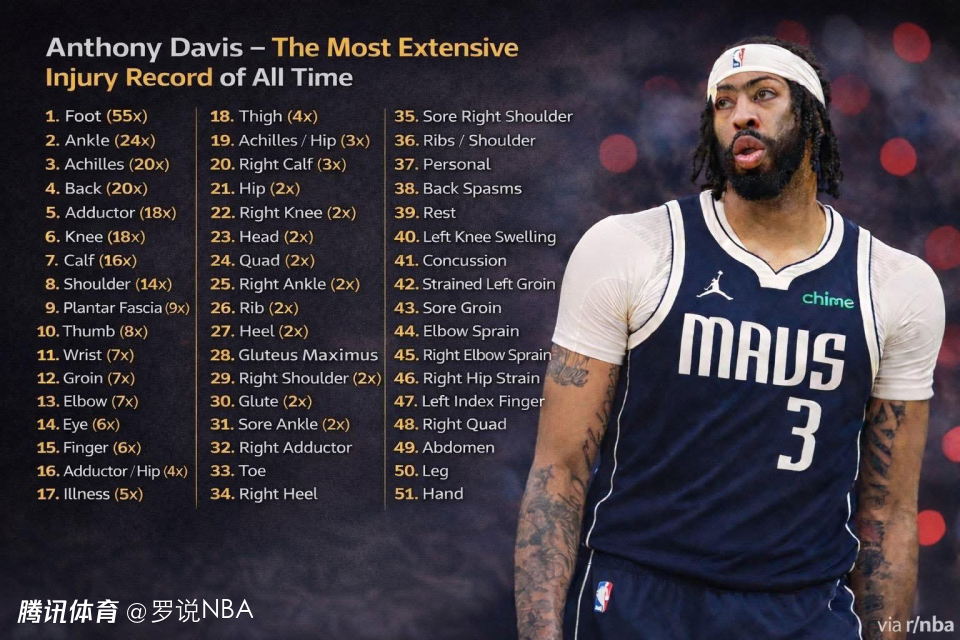 Garza表示:“戴维斯再度因左手严重伤势缺阵……他职业生涯中被记录在案的伤病已经超过285次,这笔交易的风险从一开始就显而易见。简单算笔账就知道,14个NBA赛季里出现285次伤病相关情况,平均每年超过20次。他最常见的伤病部位有哪些?脚部55次,脚踝24次,跟腱20次,背部20次。”