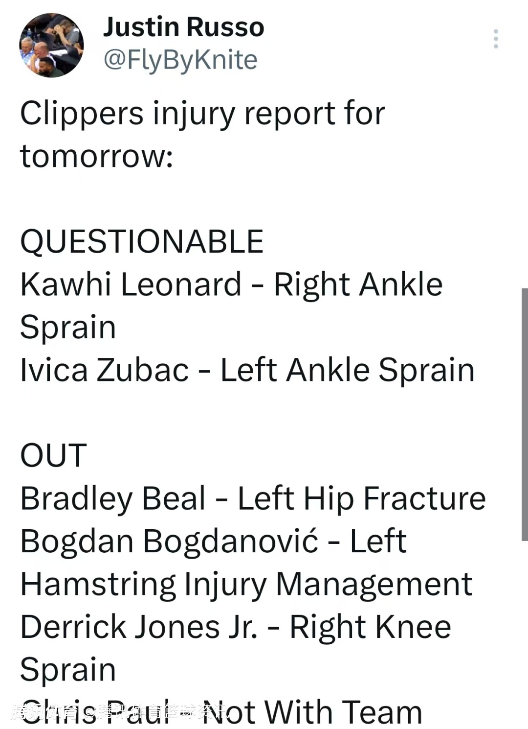 北京时间1月14日,NBA常规赛继续进行,快船明日将对阵奇才。赛前,快船官方公布球队本场比赛最新伤病报告。莱昂纳德和祖巴茨出战成疑。