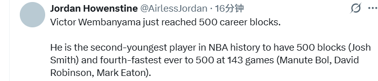 北京时间1月14日,NBA常规赛继续进行,马刺队对阵雷霆队。在上半场比赛中,文班亚马送出1次盖帽,生涯盖帽数达到500个。根据数据统计显示,他成为了NBA历史上完成500次盖帽第二年轻500的球员(仅次于约什-史密斯),用了143场比赛做到这点,是历史第4快(仅次于波尔、大卫-罗宾逊、马克-伊顿)。
