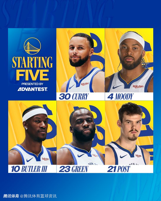勇士首发五人为:库里、巴特勒、追梦、穆迪和波斯特。