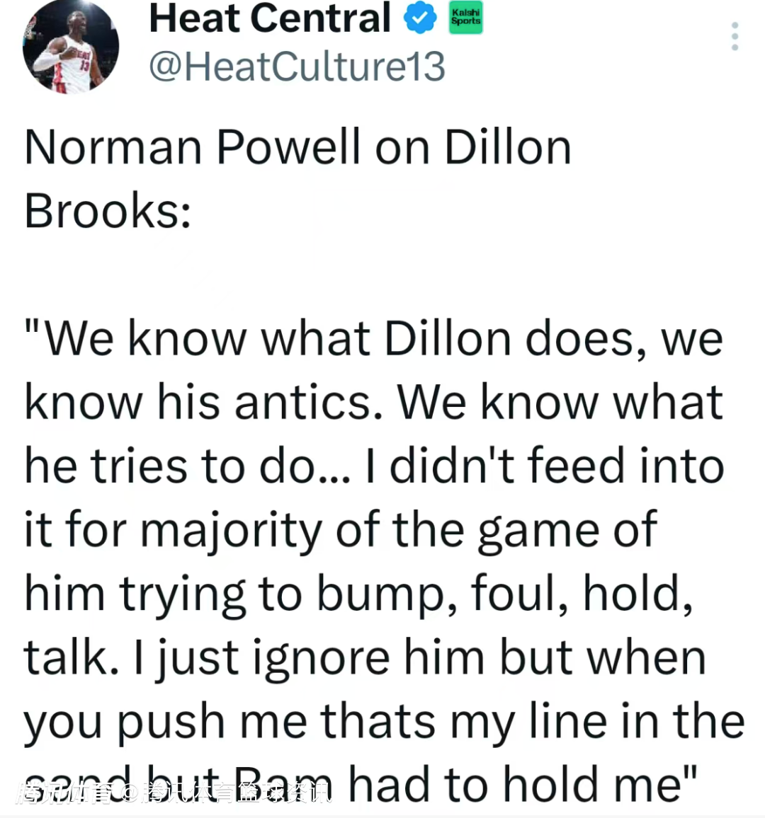 鲍威尔在谈到狄龙-布鲁克斯时说道:“我们太清楚狄龙的套路了,也知道他那些小动作。他总想搞点事情。整场比赛大部分时间,我都没搭理他的那些冲撞、犯规、拉扯和垃圾话。我就直接无视他,但当他得寸进尺推我的时候,那就是我的底线了,还好阿德巴约当时拉住了我。”