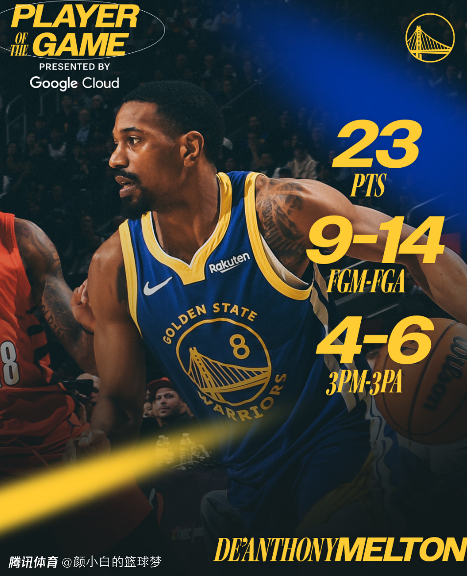 末节,科尔直接用波杰姆斯基、梅尔顿、理查德、桑托斯、霍福德的第三阵容了,开拓者是一个正常的轮换可他们这套正常轮换硬实力也非常孱弱,随后梅尔顿连拿11分接管比赛,他打成库里,比赛走向完结。